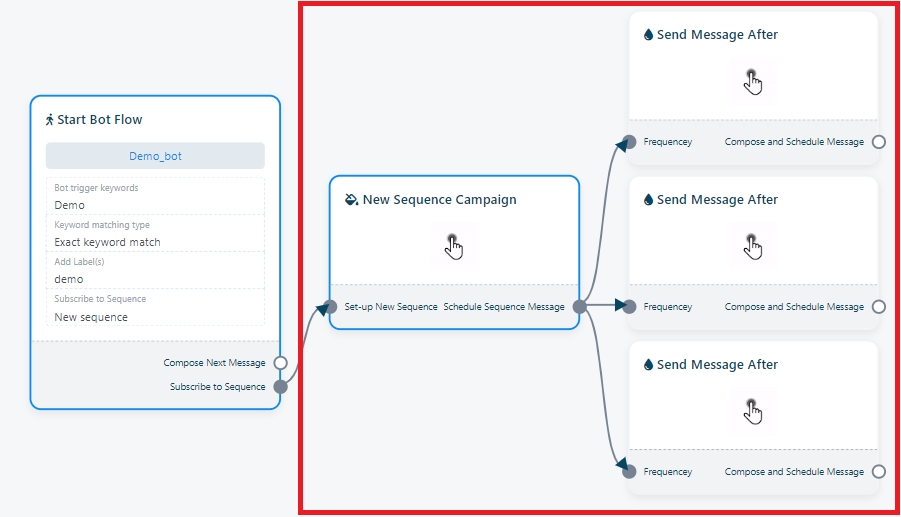 Upon completing the previous steps, you will discover three additional S`end Message After` components attached to the `sequence campaign` component.