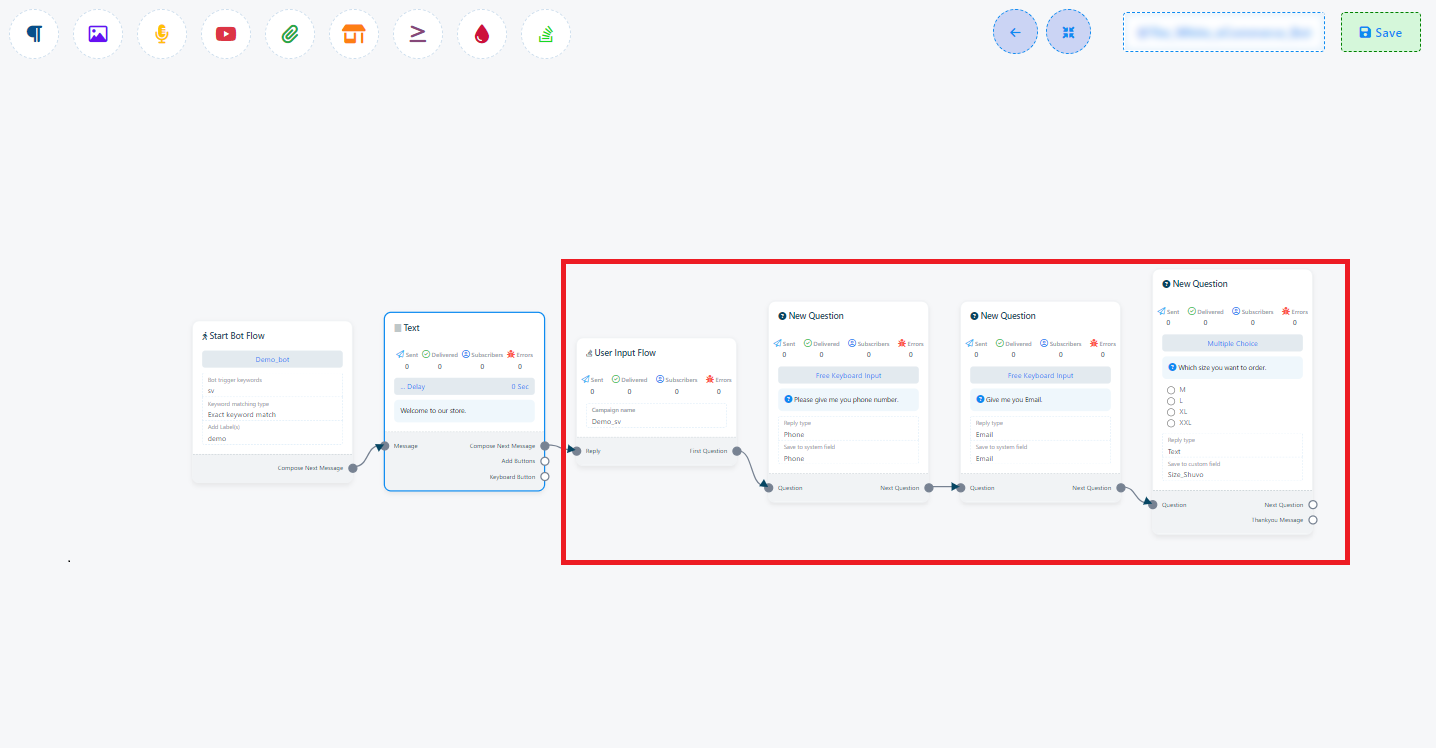 - Once you have configured your ecommerce store within the flow builder, make sure to save your changes. Afterward, you can publish your chatbot with the ecommerce feature.